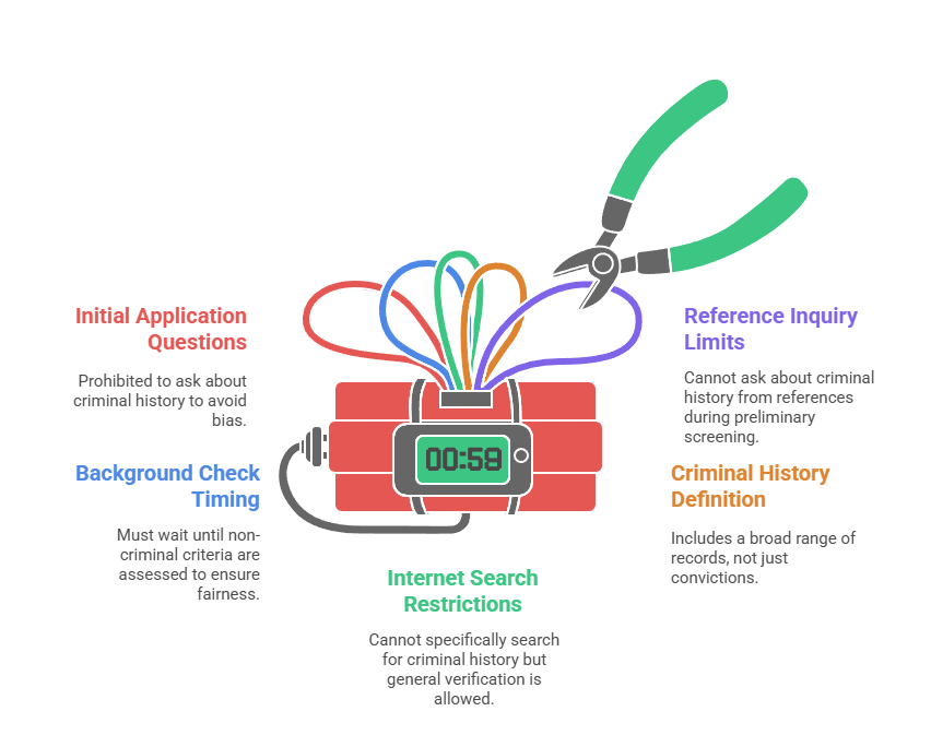 - Internet search restrictions: Searches specifically aimed at discovering criminal history during initial screening violate the ordinance, though general online searches for applicant verification remain permissible