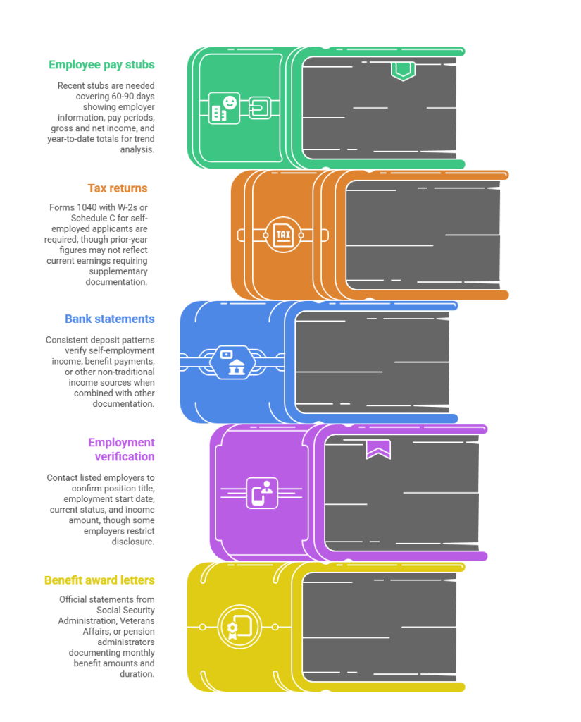 - Tax returns: Forms 1040 with W-2s or Schedule C for self-employed applicants, though prior-year figures may not reflect current earnings requiring supplementary documentation.