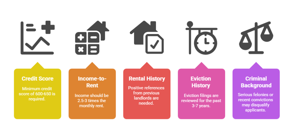 - Income-to-rent ratios: Standard requirements of 2.5-3 times monthly rent ensure sufficient income for rent obligations plus other living expenses without creating excessive barriers.