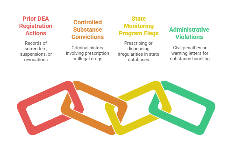- Prior DEA Registration Actions: Surrenders, suspensions, or revocations indicating serious compliance failures