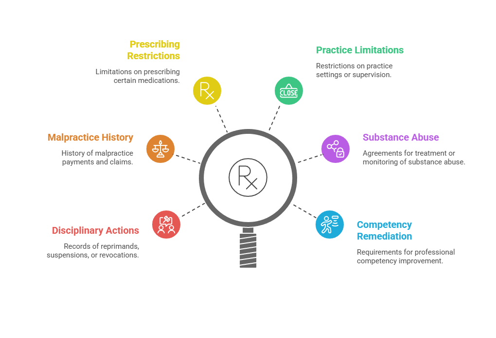| Medical Licenses | State Medical Boards | Active status, disciplinary actions, practice restrictions, malpractice history |