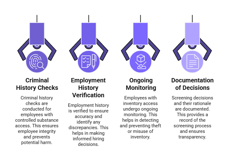 Healthcare compliance employment screening in pharmaceutical contexts also intersects with controlled substance regulations. Organizations that manufacture, distribute, or conduct research with controlled substances face additional personnel screening obligations. These requirements help prevent diversion and unauthorized access and may include:
