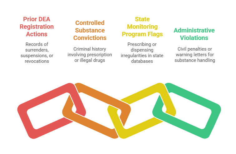 - Prior DEA Registration Actions: Surrenders, suspensions, or revocations indicating serious compliance failures