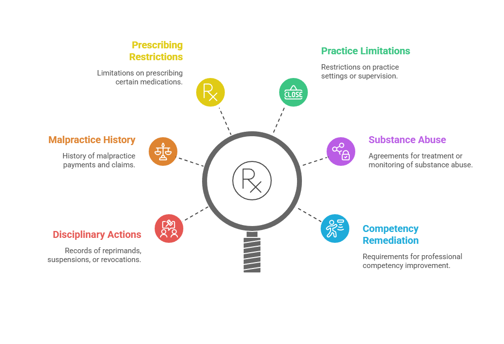 | Medical Licenses | State Medical Boards | Active status, disciplinary actions, practice restrictions, malpractice history |