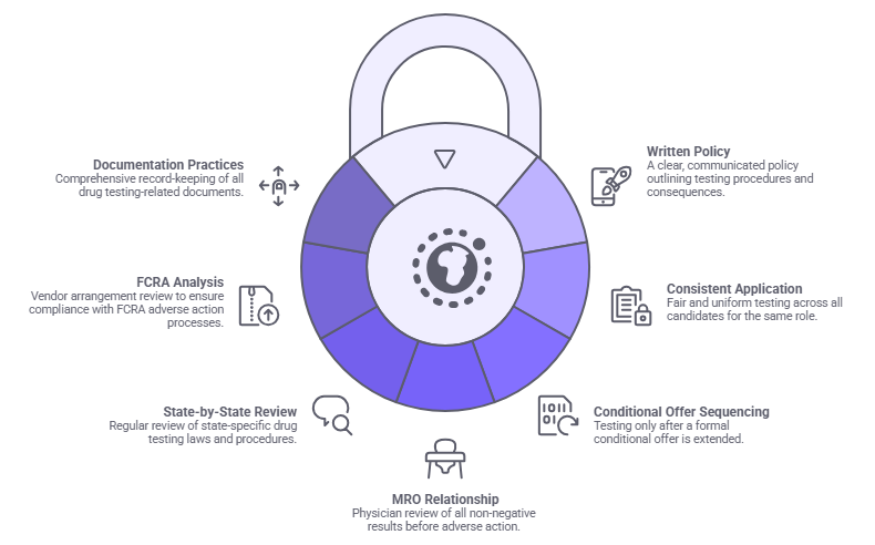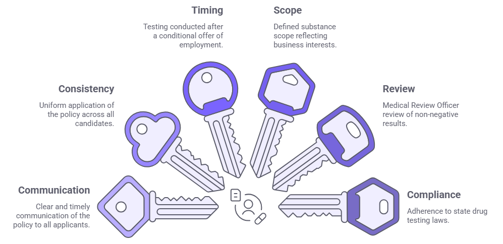 - A written drug testing policy communicated to applicants before testing, covering substances tested, specimen type, timing, and consequences of a positive result.