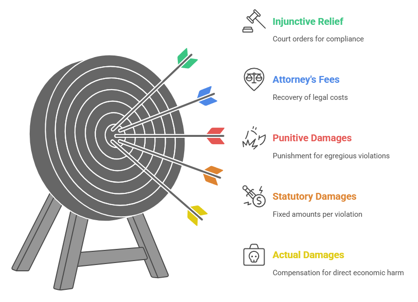 - Injunctive relief: Court orders requiring specific compliance actions or prohibiting continued violations
