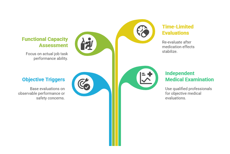 - Objective triggers: Base evaluation requirements on observable performance concerns, safety incidents, or verifiable behavioral changes rather than medication use alone.