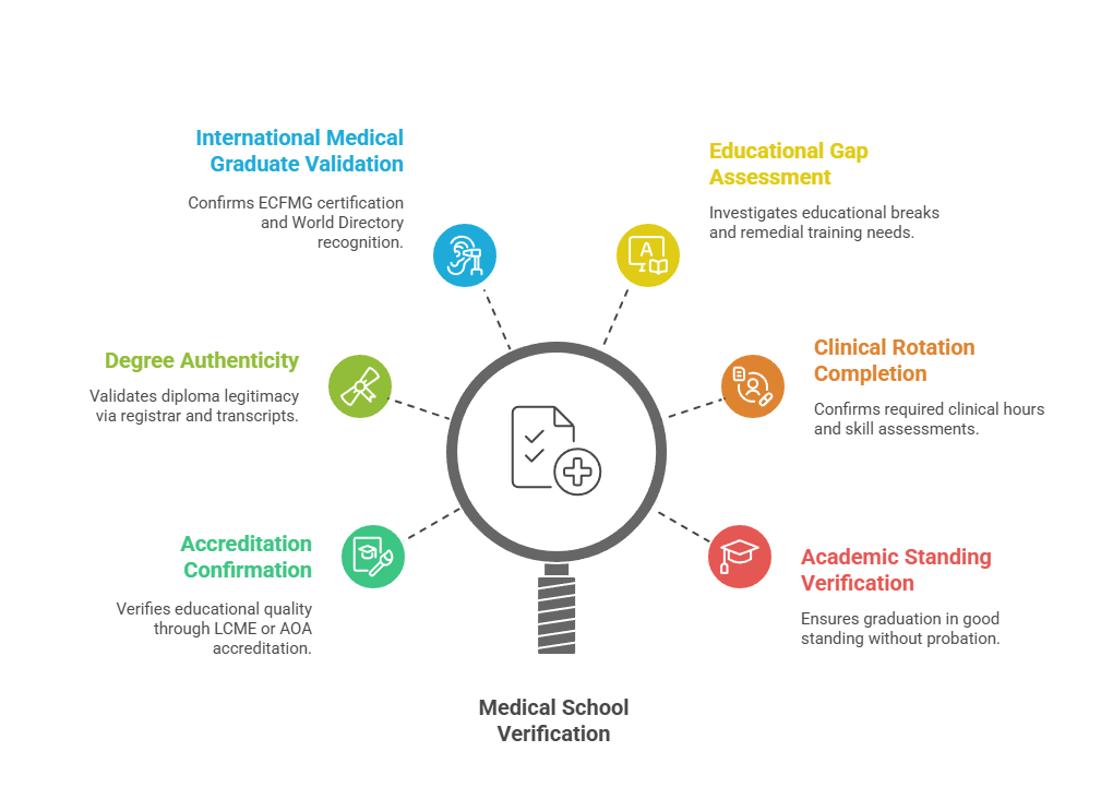 Medical school verification services include degree completion confirmation, graduation date validation, and accreditation status verification through LCME or AOA. Additionally, complete services verify residency completion, fellowship training, ECFMG certification for international graduates, and board certification status. These ensure candidates possess complete training required for medical practice and satisfy Joint Commission requirements.
