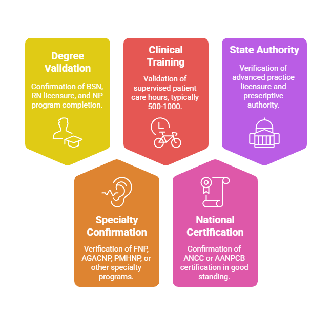 - Multi-level degree validation: Confirmation of BSN completion, RN licensure, and graduate NP program completion