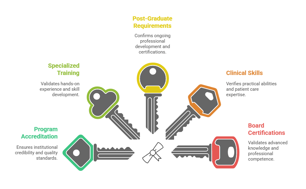 - Clinical training hours: Validation of supervised patient care hours, typically 500-1000 hours depending on specialty