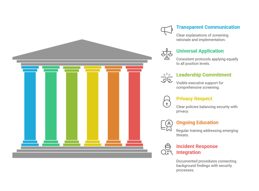 - Transparent Communication: Clear explanations of screening rationale and implementation demonstrating that checks protect all employees by ensuring colleagues meet security standards.