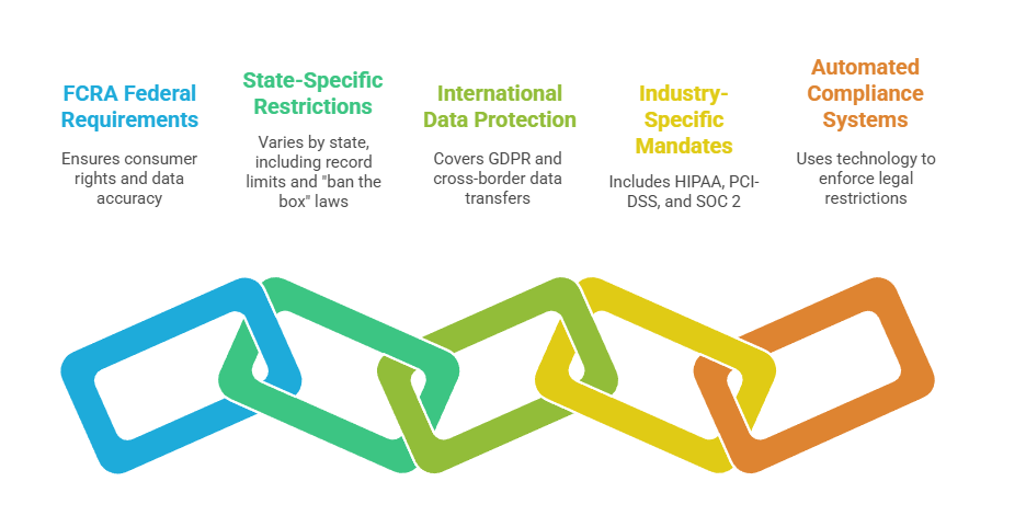 - State-Specific Restrictions: California's seven-year criminal record limit, "ban the box" laws in 37 states, state credit report limitations, and varying statutes requiring location-specific protocols.