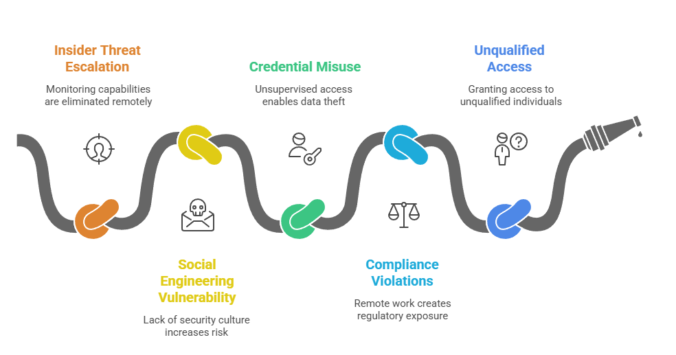 - Remote work security risks escalate when organizations skip education verification and professional credential validation, enabling unqualified individuals to access systems requiring specialized security knowledge.