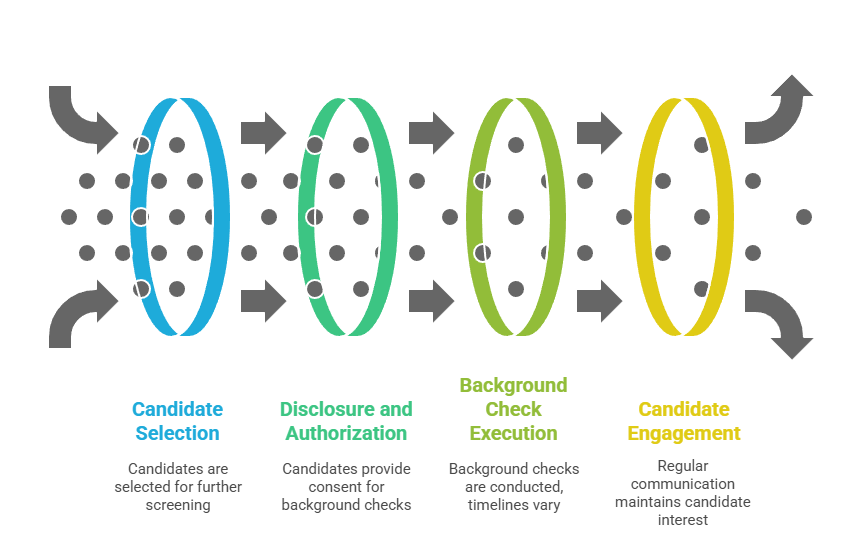 Following candidate selection but before final offers, the background check sequence begins with disclosure and authorization. Clear communication about screening timelines sets appropriate expectations. This is particularly important when competing for talent in competitive startup markets. Most comprehensive background checks for remote employees require 5-10 business days. However, international components may extend timelines to 3-4 weeks. During the screening period, maintaining candidate engagement becomes critical. Regular communication prevents candidate drop-off, especially when competing offers may emerge.