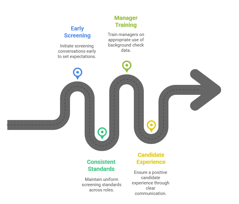 - Start screening conversations early in hiring processes rather than surprising candidates with unexpected background checks. Transparency about screening requirements during initial interviews sets appropriate expectations. It identifies potential concerns before significant time investment. This approach respects candidate time while protecting company interests.