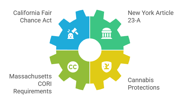 - New York Article 23-A: Requires employers to consider eight specific factors before denying employment based on criminal convictions, including the relationship between the offense and job responsibilities, time elapsed since the conviction, and evidence of rehabilitation.