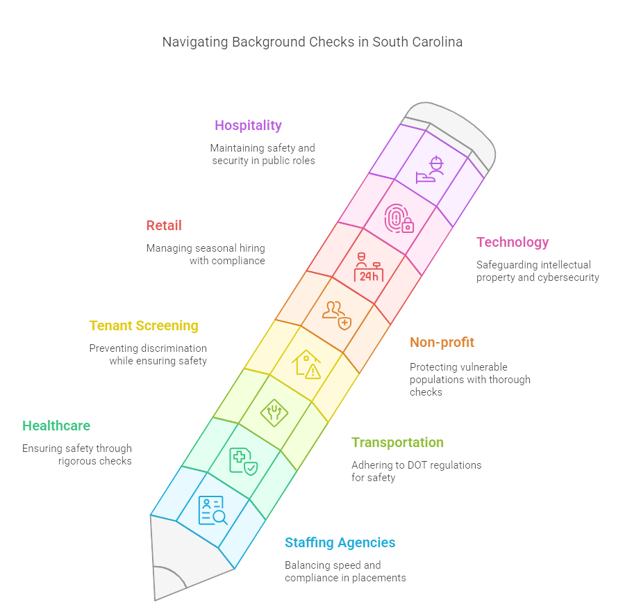The approach varies across different sectors when navigating background checks due to specific legal requirements and operational nuances. Here’s a breakdown that highlights the critical aspects of various industries operating in South Carolina: