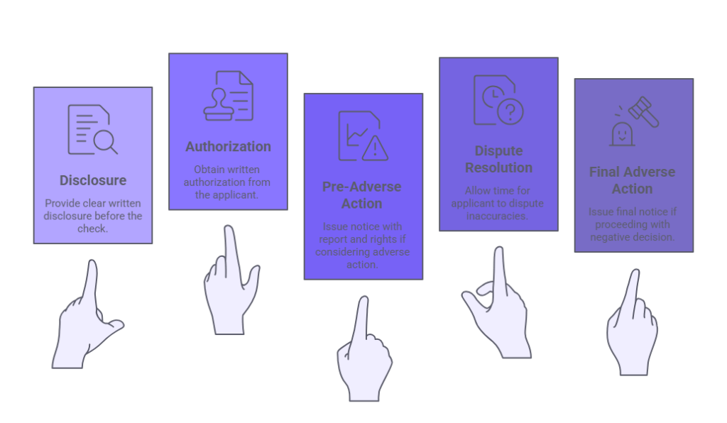 - Providing pre-adverse action notice including a copy of the report and Summary of Rights if adverse action is being considered