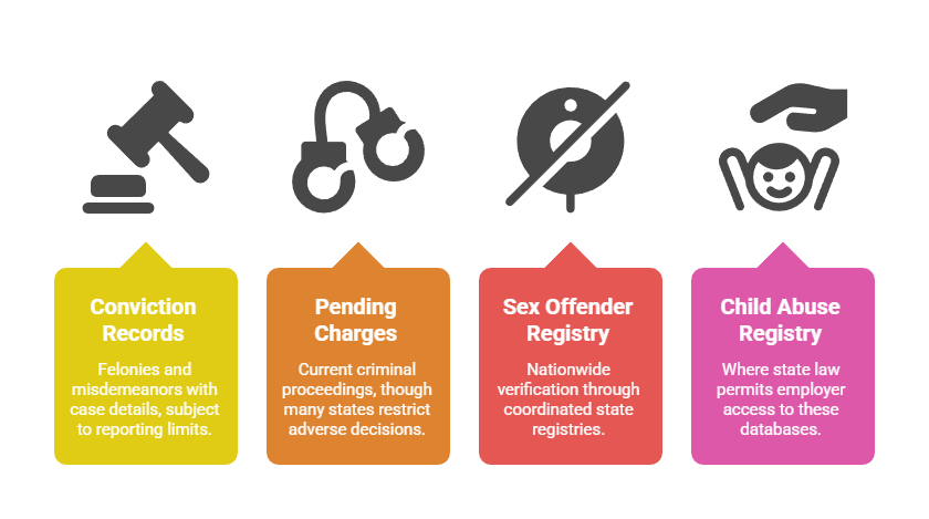 - Conviction records: Felonies and misdemeanors with case details, subject to seven-year or ten-year reporting limits in many states