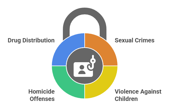 - Sexual crimes against minors: Rape, child molestation, child pornography possession or distribution as defined by applicable state law