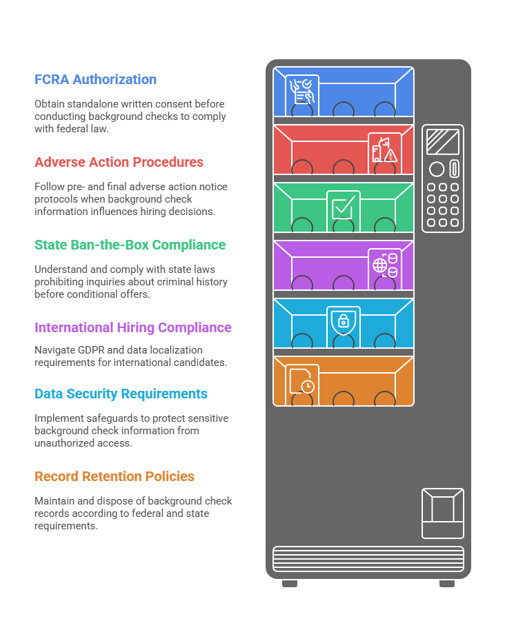 - Data Security Requirements: Implement appropriate technical and administrative safeguards to protect sensitive background check information from unauthorized access or breaches.