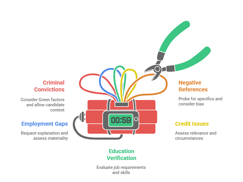 Criminal record evaluation should consider offense nature, time elapsed since conviction, evidence of rehabilitation, and relationship to job responsibilities. A ten-year-old misdemeanor conviction for marijuana possession has minimal relevance for most tech positions, while recent fraud convictions deserve serious consideration for roles involving financial access. Documentation of the assessment rationale provides protection if hiring decisions are challenged. Employment verification discrepancies require investigation before reaching conclusions.