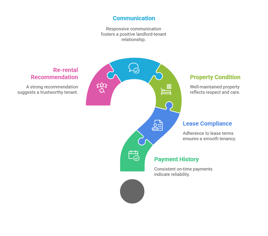 - Payment history: Did the tenant pay rent on time consistently, and how many late payments occurred during the tenancy?