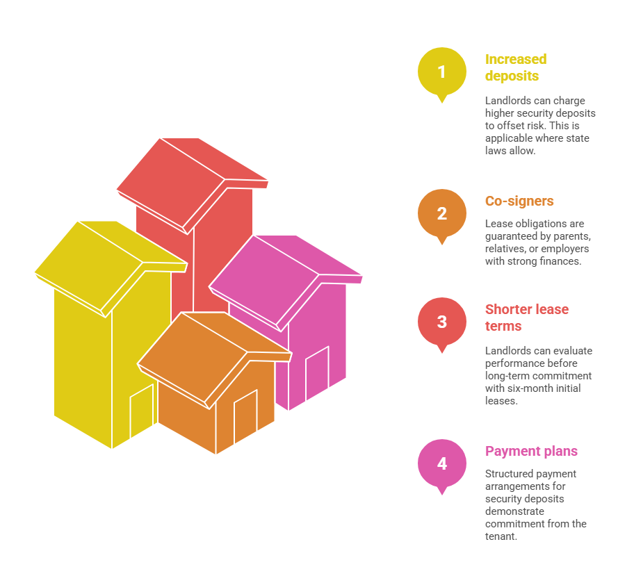 - Co-signers or guarantors: Parents, relatives, or employers with strong finances guarantee lease obligations.