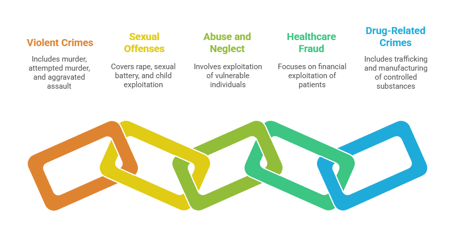- Sexual offenses including rape, sexual battery, or child exploitation