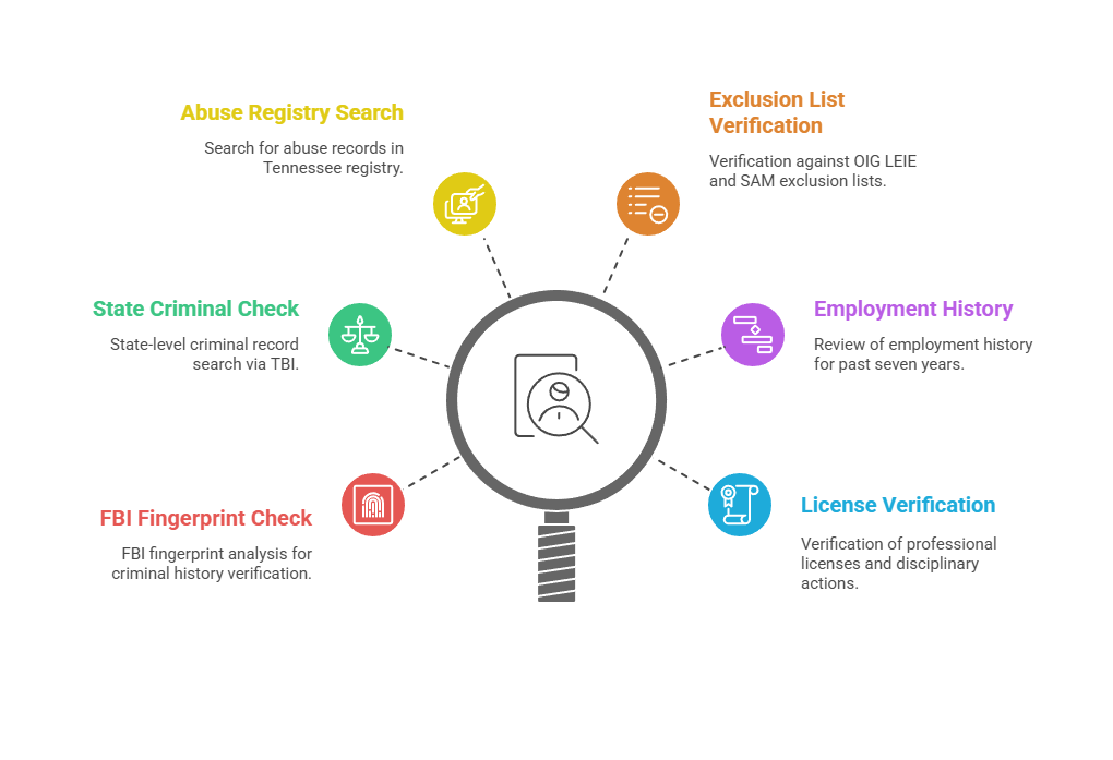 - Tennessee healthcare facilities must conduct comprehensive background checks including FBI fingerprinting, state criminal records, and OIG exclusion list screenings for all direct patient care workers.