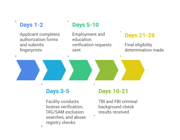 - Days 3-5: Facility conducts license verification, OIG/SAM exclusion searches, and abuse registry checks