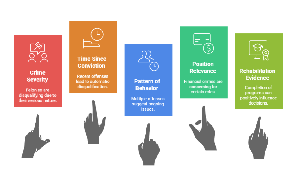 - Certain felonies automatically disqualify candidates, while misdemeanors and financial issues are evaluated case-by-case based on recency and relevance.