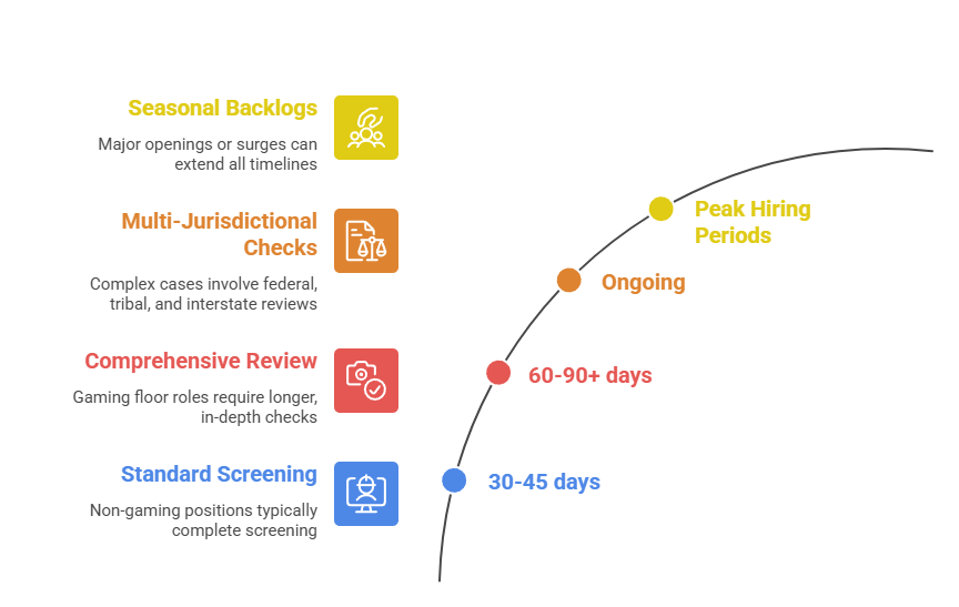- Processing times range from 30-90 days depending on position level, with gaming floor roles requiring the most comprehensive screening.