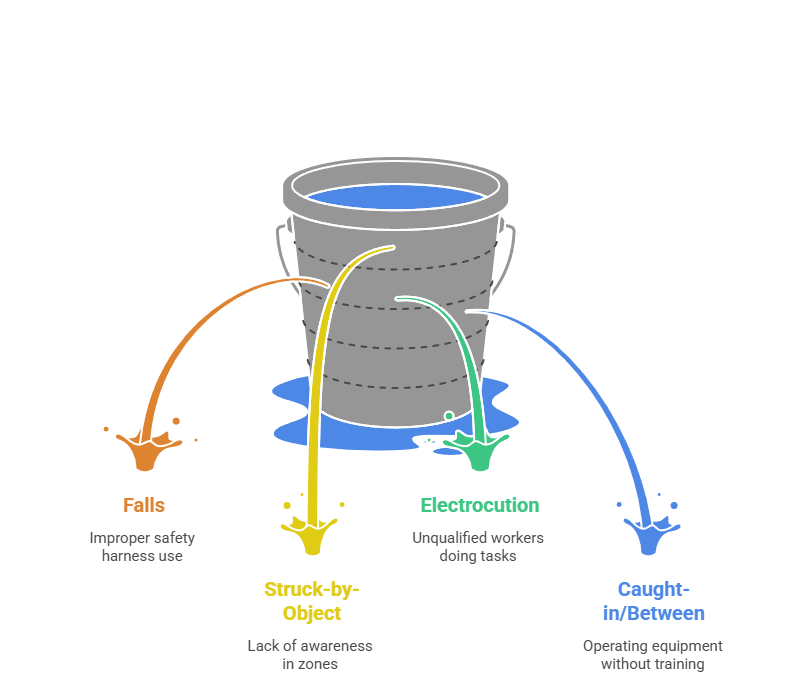 - Caught-in/Between: Results in 7% of fatalities when workers operate equipment without proper training or certification