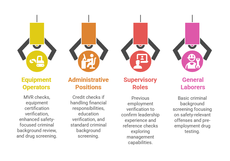 Not all construction positions carry identical risks or regulatory requirements. Administrative staff, equipment operators, project managers, and general laborers require different screening components based on job responsibilities, safety implications, and compliance obligations.