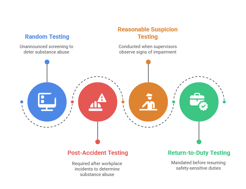 - Reasonable Suspicion Testing: Conducted when supervisors observe behavior or physical symptoms suggesting impairment