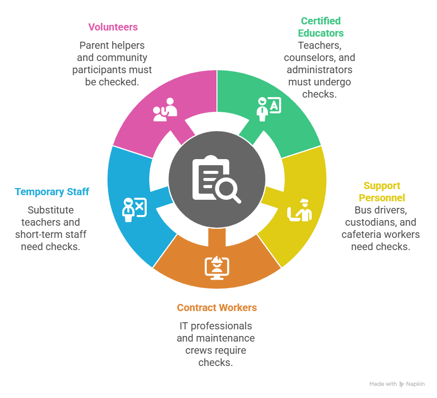 - Temporary staff members like substitute teachers, short-term replacements, and seasonal employees face identical screening requirements regardless of their employment duration or frequency of student contact.
