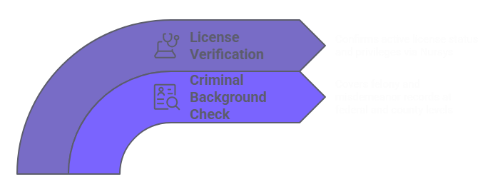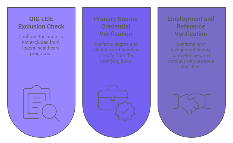 The split between agency and facility credentialing responsibility is a frequent source of compliance gaps. In most travel nursing arrangements, the agency completes the pre-placement credentialing package, including criminal background check, license verification, credential authentication, and OIG exclusion check, and delivers it to the facility before the nurse's start date. The facility then reviews that package against its internal standards, confirms all components meet its requirements, and conducts any additional competency assessments specific to its unit.