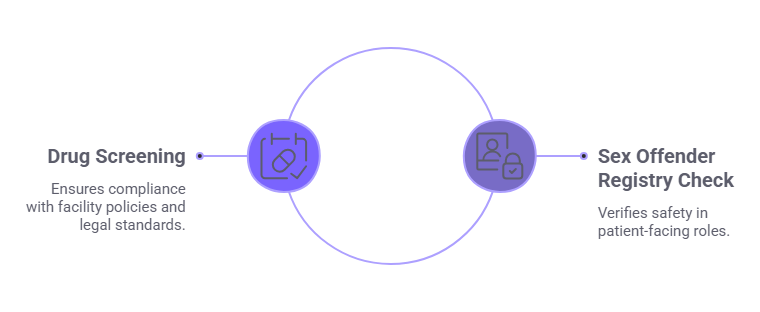• The complete screening package includes seven components: criminal background check, Nursys license verification, OIG exclusion check, credential verification, employment verification, drug screening, and sex offender registry check.