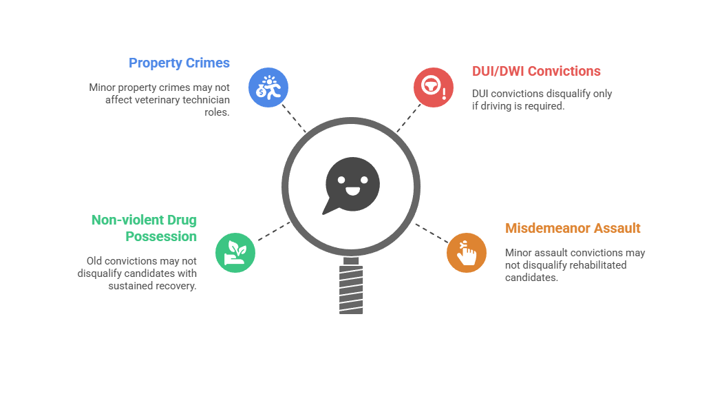 Common disqualifying factors include felony convictions for animal cruelty or neglect, recent controlled substance offenses (typically within 5-7 years), fraud or theft convictions particularly related to healthcare, and violent crime convictions. Most state licensing boards conduct individualized assessments considering rehabilitation evidence, time elapsed since convictions, and specific job relevance.
