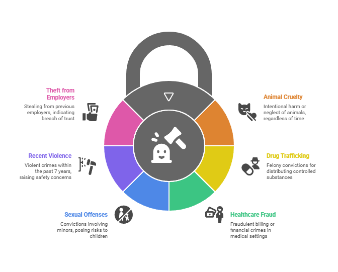 - Sexual offenses involving minors: These convictions create unacceptable risks in settings where minor children frequently visit with family pets