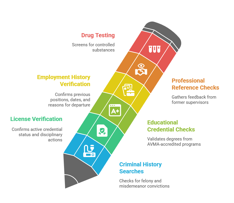 Comprehensive veterinary technician background verification extends beyond basic criminal history checks. Multiple verification components together provide employers with a complete picture of candidate suitability.