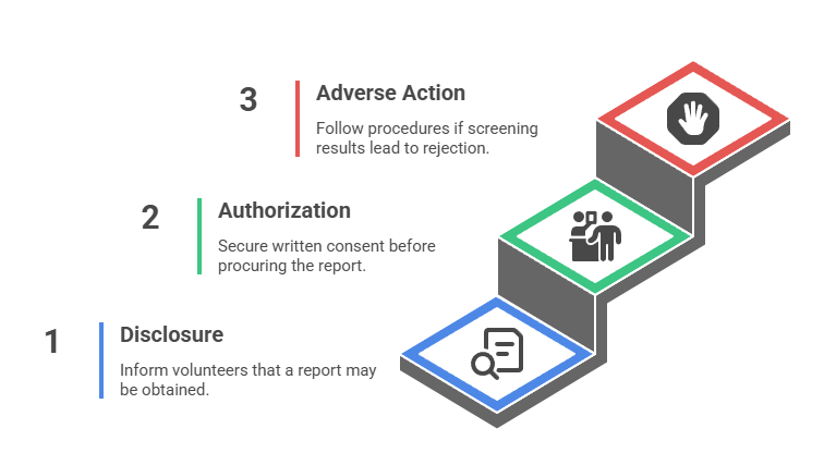 The FCRA applies when organizations use consumer reporting agencies to obtain background information for volunteer screening purposes. This triggers disclosure, authorization, adverse action, and record-handling requirements. Organizations conducting internal checks may face different regulatory frameworks but should implement comparable procedural protections.