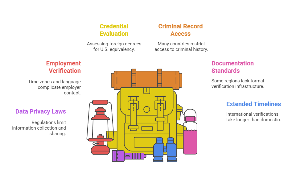 - Employment verification barriers: Time zones, language differences, and varying disclosure norms complicate previous employer contact