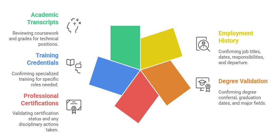 - Professional certifications: Verification through issuing organizations validates current certification status and any disciplinary actions