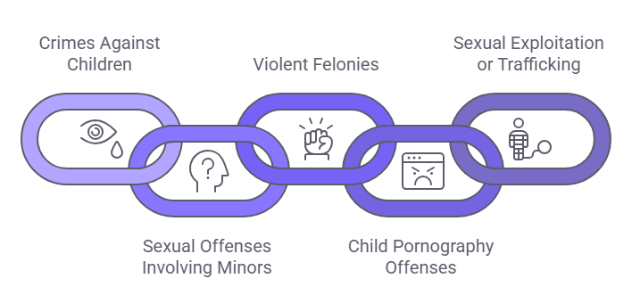 This category represents the most universally prohibited group of offenses. These violations include child abuse, child neglect, child endangerment, contributing to the delinquency of a minor, and child pornography possession or distribution.