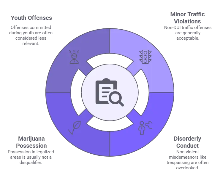 These offenses represent convictions that do not typically warrant disqualification absent aggravating factors. Green-category violations may include: