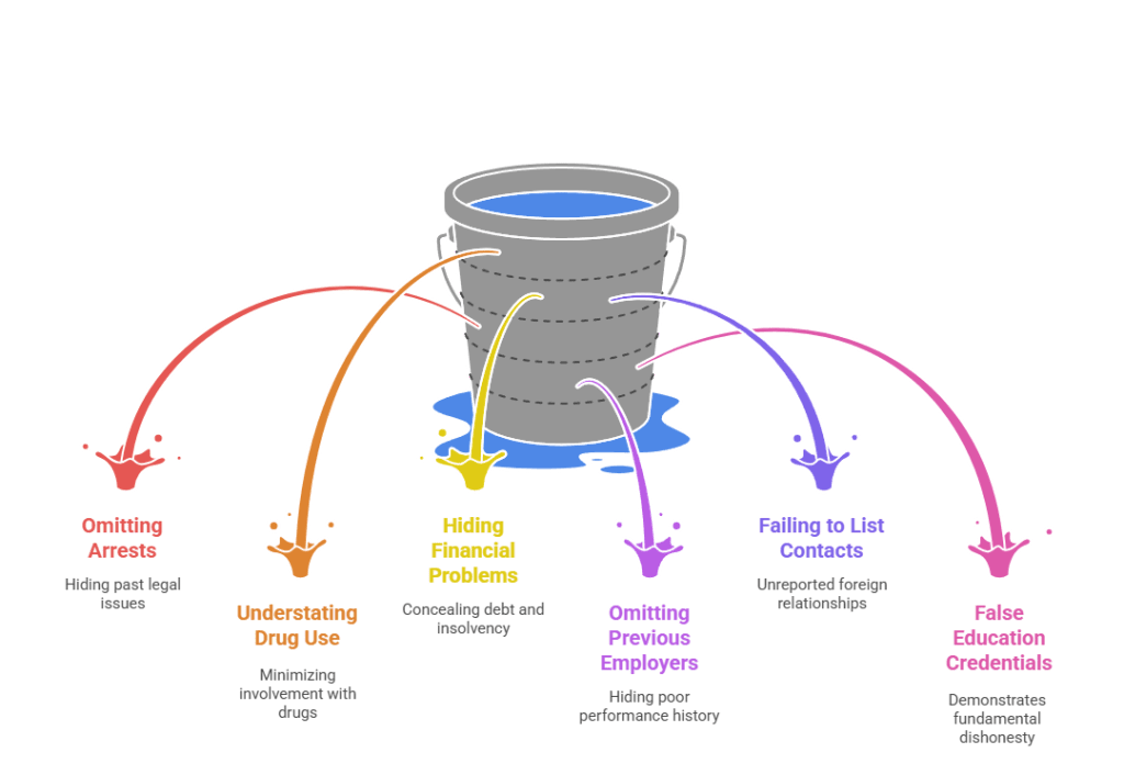 - Failing to list foreign contacts or travel: Unreported foreign relationships or international travel raises counterintelligence red flags.
