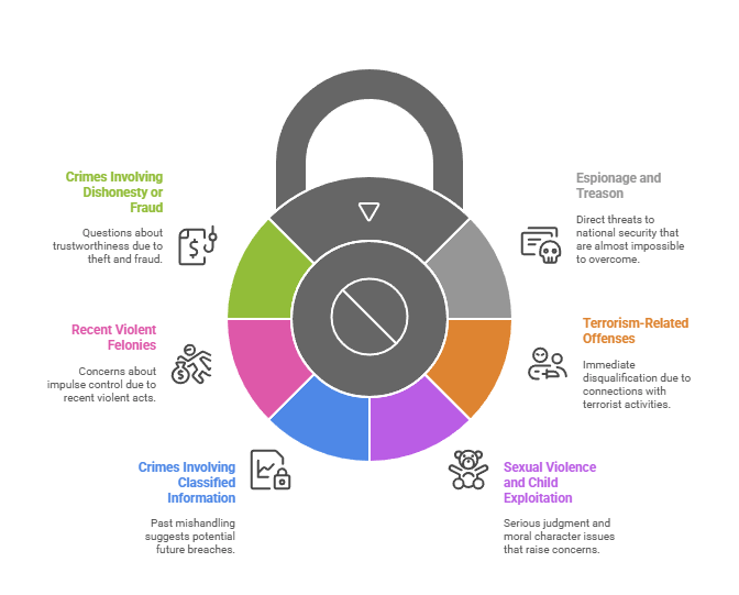- Espionage and treason: These offenses directly threaten national security and create nearly insurmountable obstacles to clearance approval.