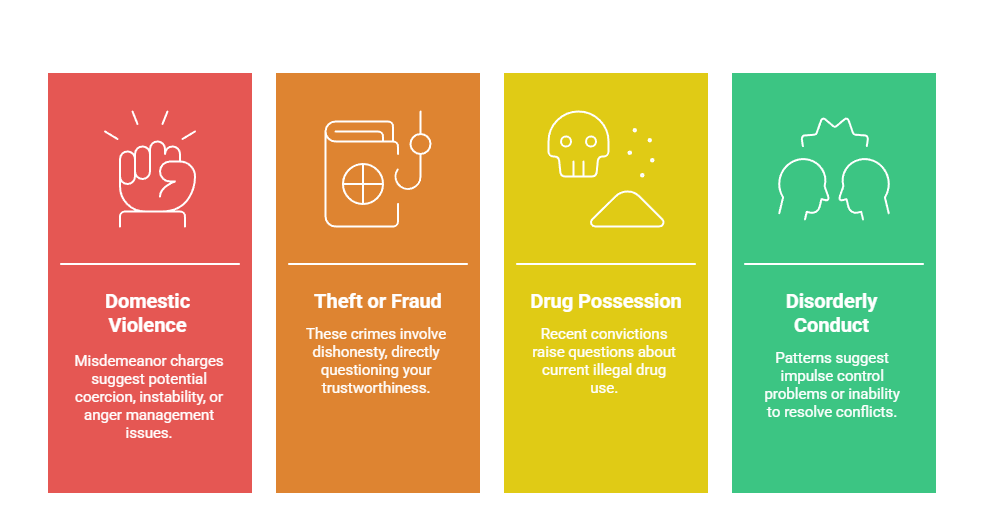 - Theft or fraud-related offenses: These crimes involve dishonesty, directly questioning your trustworthiness regardless of conviction severity.
